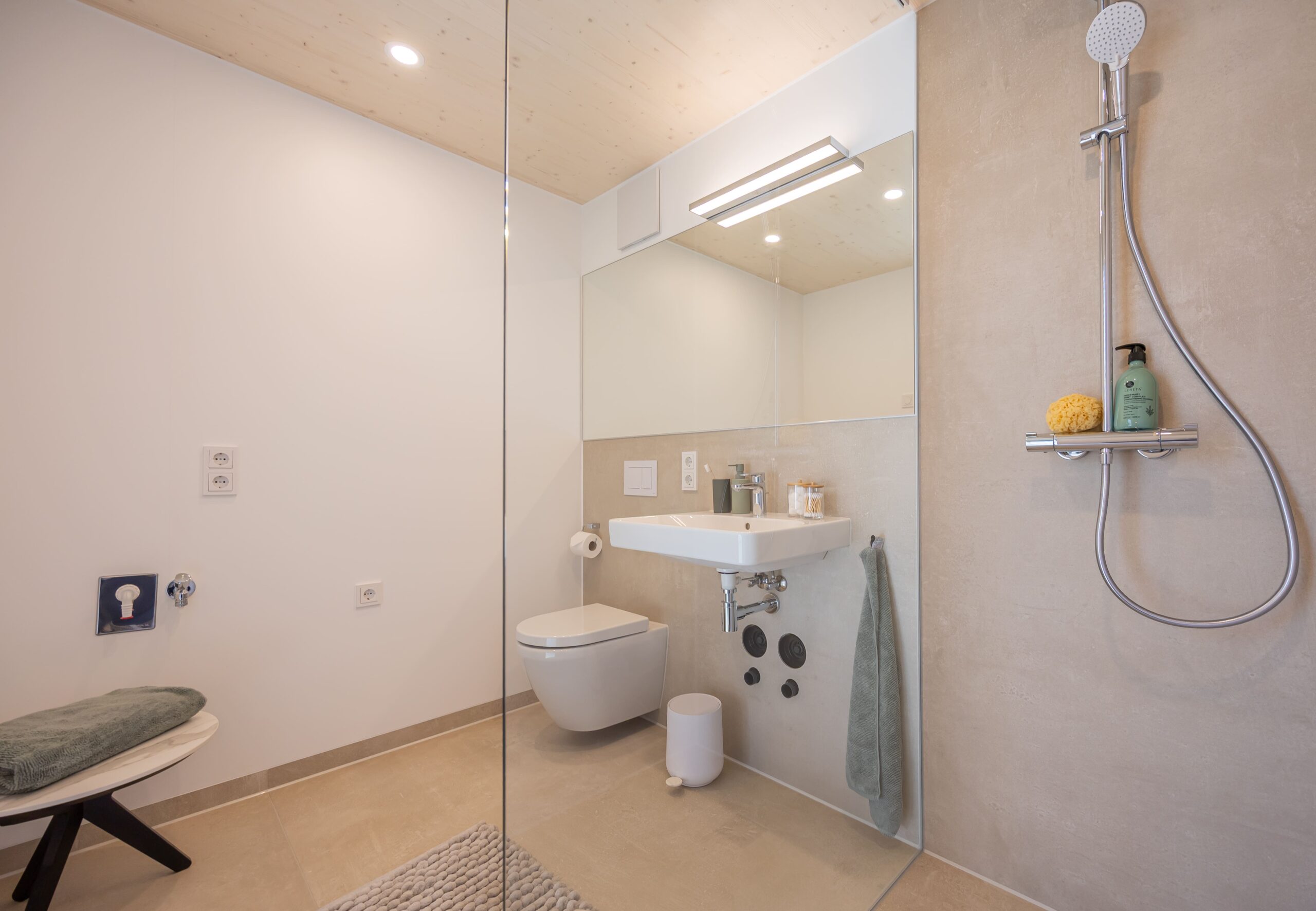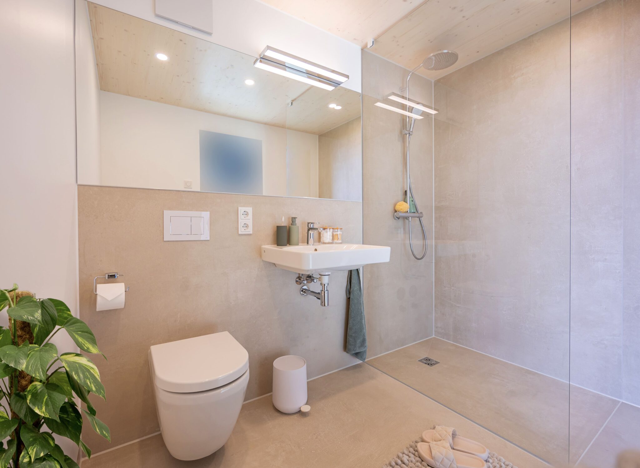 Das Projekt Schwarz begeistert mit exklusiven Badmodulen der Serie INVERNESS. Die Bäder verbinden zarte Beigetöne der Fliesen mit zeitlosem Weiß an Wänden und Keramik und schaffen so eine freundliche, einladende Atmosphäre. Eine zart lasierte Holzdecke setzt natürliche Akzente, während chromfarbene Armaturen für stilvolle Highlights sorgen. Das Ergebnis sind Räume, die Klarheit, Ruhe und zeitlose Eleganz miteinander verbinden – perfekt für modernes, lichtdurchflutetes Wohnen.