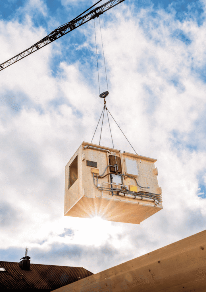 Die Badmodule werden mit klar definierten technischen Vorgaben geplant, vorbereitet und geschossweise per Kran eingehoben. Präzise Einbauanleitungen, abgestimmte Schnittstellen und frühzeitige Planung sorgen für einen reibungslosen, sicheren Ablauf auf der Baustelle.