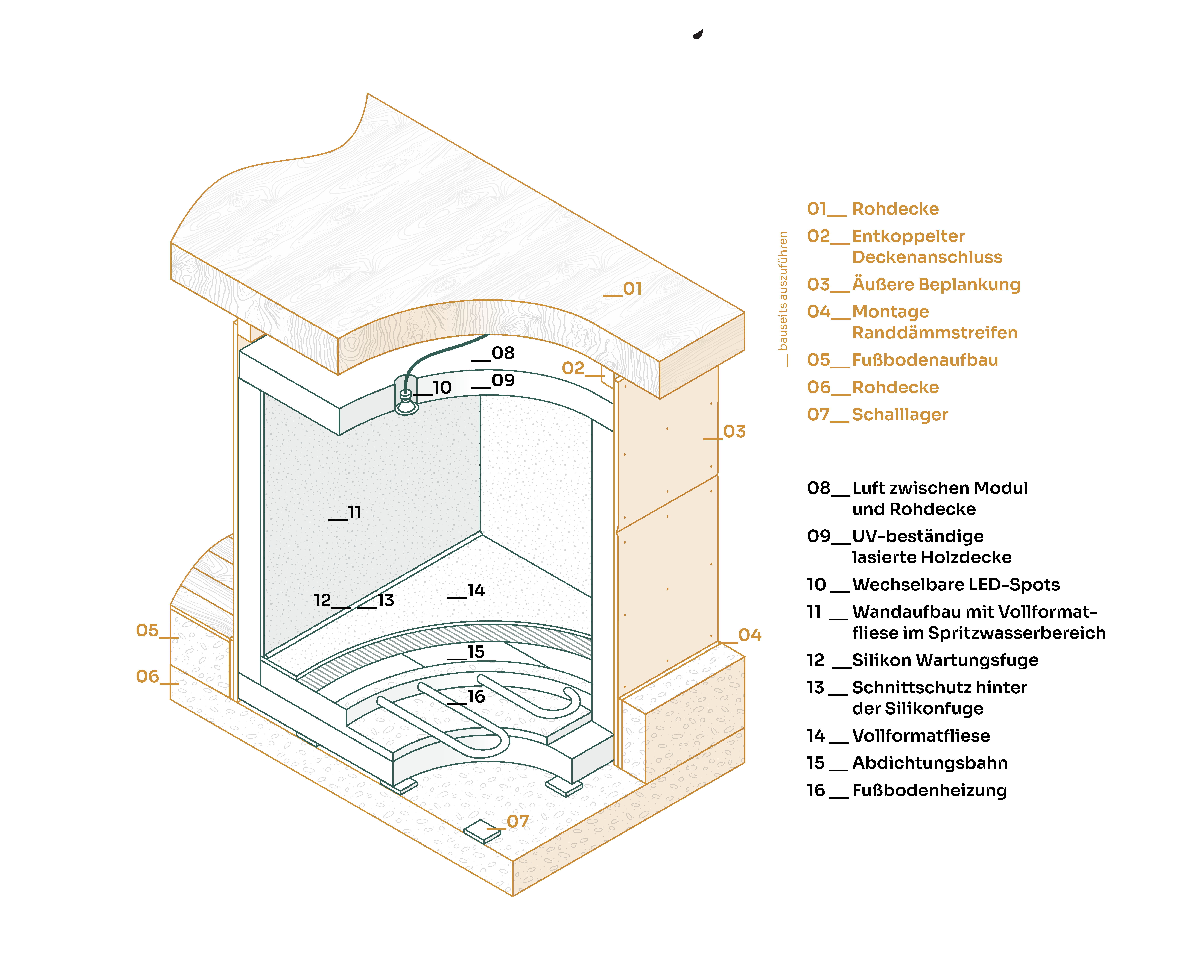 Der Modulschnitt veranschaulicht den inneren Aufbau eines Tjiko-Badmoduls mit allen relevanten Ebenen für Konstruktion, Installation und Anschlüsse. Er bietet eine transparente Grundlage für Planung und Abstimmung und zeigt, wie technische Komponenten effizient und platzsparend integriert sind.