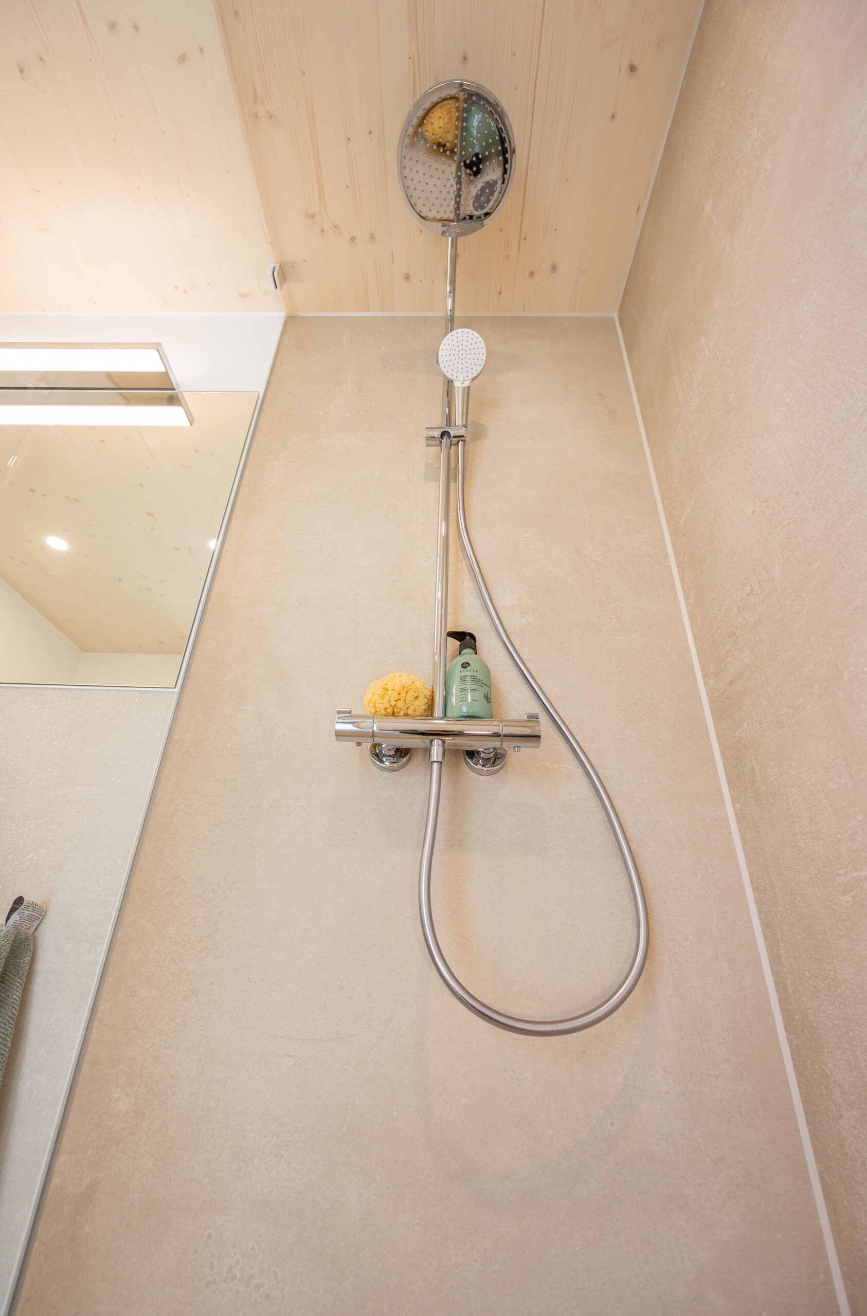Das Projekt Schwarz begeistert mit exklusiven Badmodulen der Serie INVERNESS. Die Bäder verbinden zarte Beigetöne der Fliesen mit zeitlosem Weiß an Wänden und Keramik und schaffen so eine freundliche, einladende Atmosphäre. Eine zart lasierte Holzdecke setzt natürliche Akzente, während chromfarbene Armaturen für stilvolle Highlights sorgen. Das Ergebnis sind Räume, die Klarheit, Ruhe und zeitlose Eleganz miteinander verbinden – perfekt für modernes, lichtdurchflutetes Wohnen.