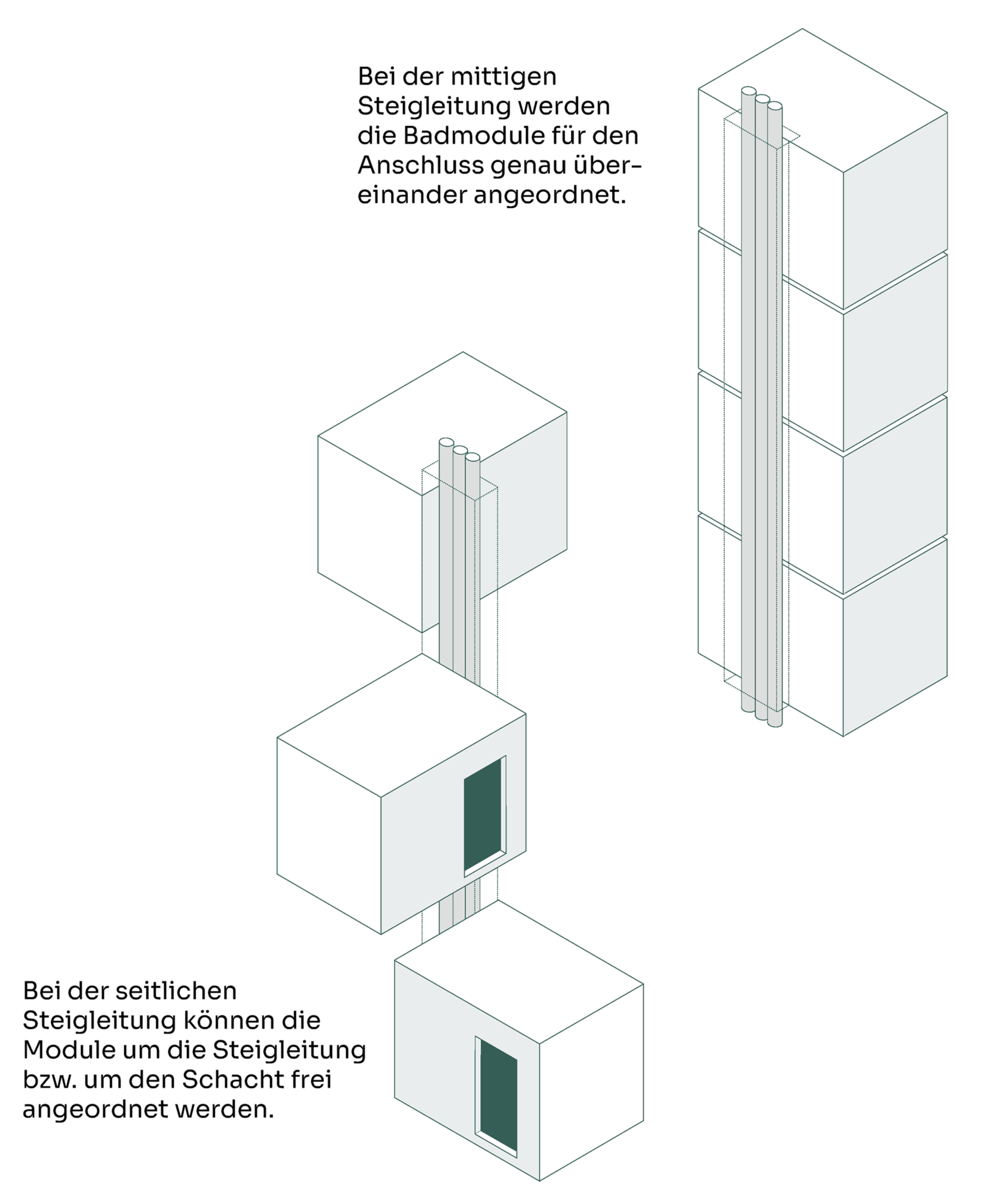Die Steigleitungen verbinden die einzelnen Geschosse und bilden den Übergabepunkt zwischen Badmodul und Gebäudetechnik. Die Module werden so vorbereitet, dass alle Leitungen mit der definierten Überlänge an der gewünschten Position bereitliegen und bauseits schnell und unkompliziert angeschlossen werden können. Voraussetzung ist eine gute Zugänglichkeit der Schächte und Übergabepunkte, damit die jeweiligen Gewerke die Schächte inklusive Brandschott fachgerecht ausführen und die Modulanschlüsse sicher herstellen können.